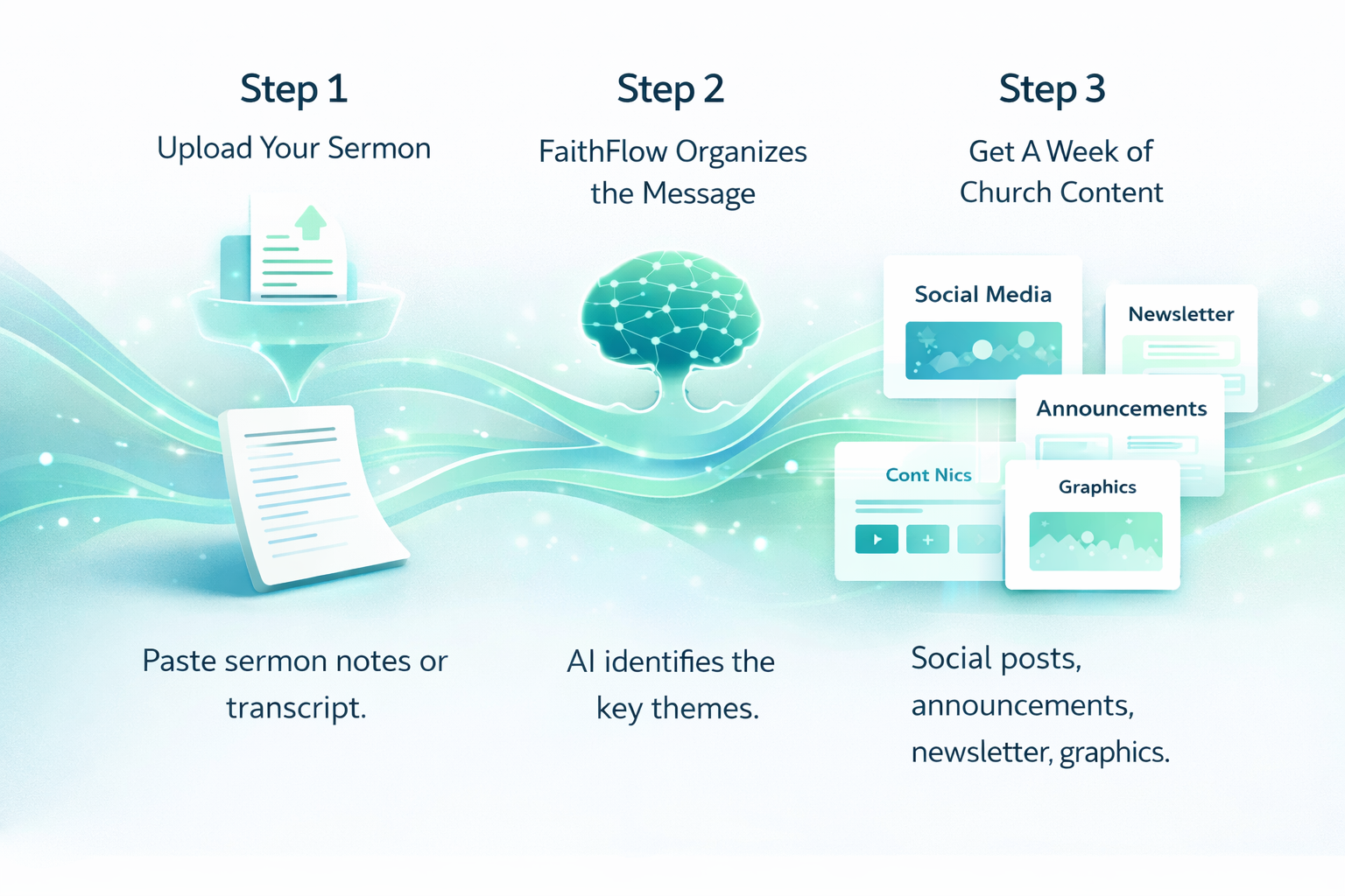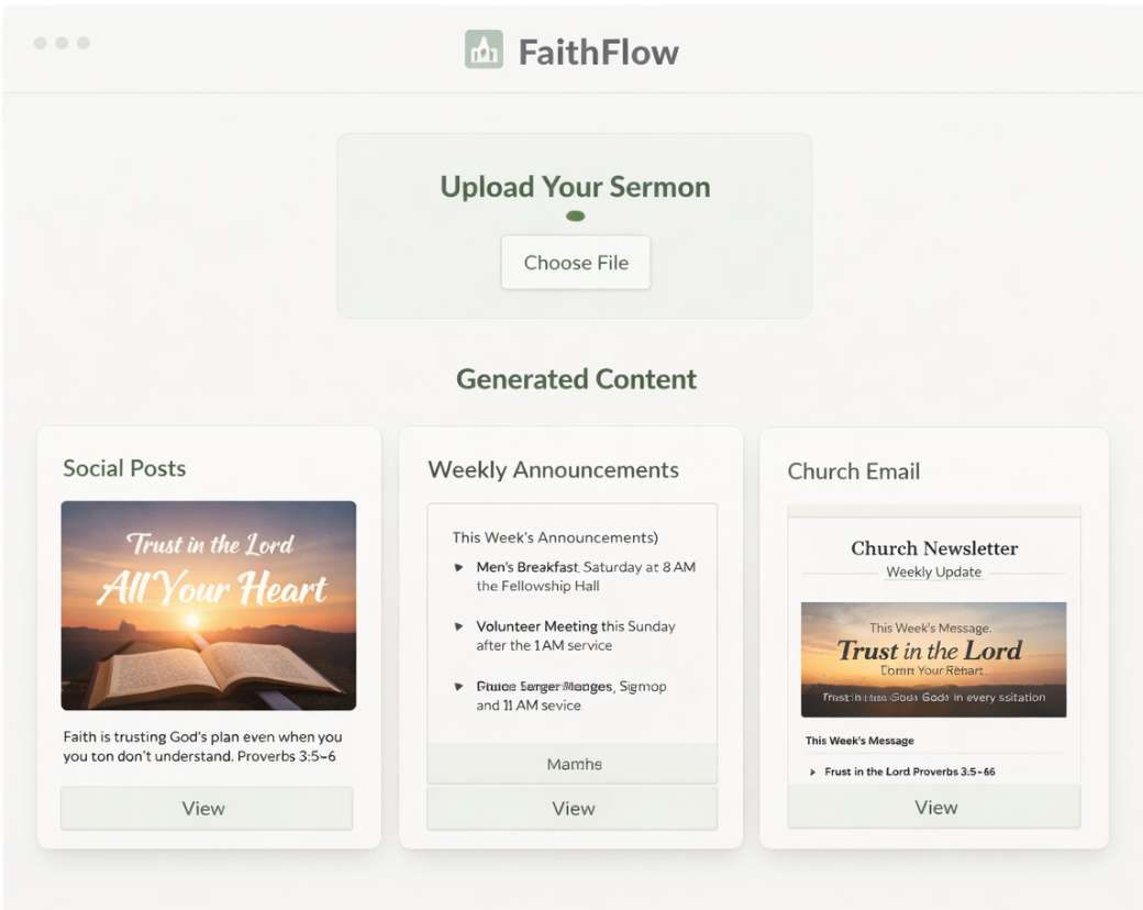 FaithFlow takes the message you already prepare each week and transforms it into clear, organized communication for your church. From social posts to newsletters, announcements, and graphics, one sermon becomes a full week of content that helps your congregation stay connected to the message.