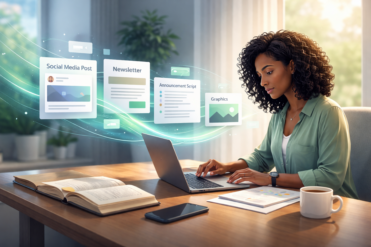Social posts, announcements, emails, and visuals—created in minutes, not hours.